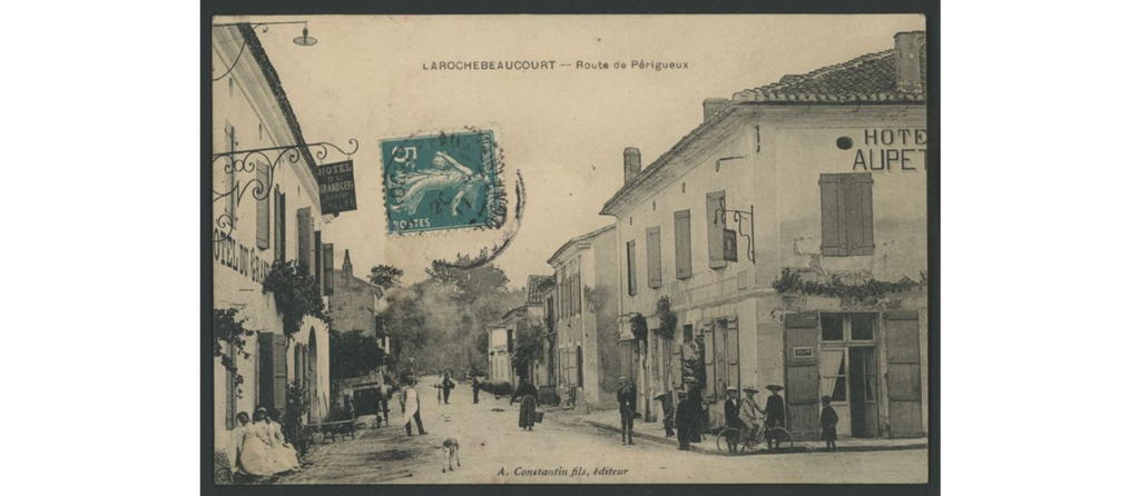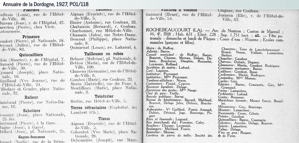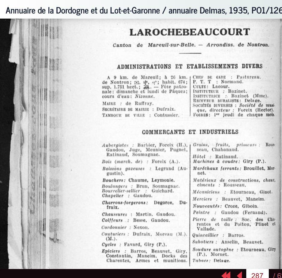 Un petit détour par les archives départementales de la Dordogne permet de consulter les anciens annuaires du département... et de s'imaginer ce qu'était le village de La Rochebeaucourt à l'époque où on y trouvait 8 aubergistes, 2 bouchers, 1 chapelier, 2 forgerons, 2 coiffeurs, 1 cordonnier, 2 couturiers, 1 vendeur de vélos, 2 épiciers, 1 fabricant de boissons gazeuses, 2 primeurs, 1 hôtel, 1 vendeur de matériaux de construction, 2 mécaniciens, 2 merceries, 1 peintre, 2 tailleurs de pierre, 1 quincailler, 1 sabotier et 1 vendeur de tabac (en 1935, par exemple).